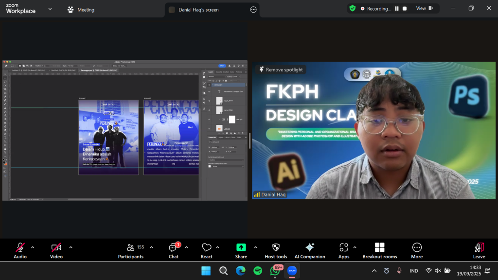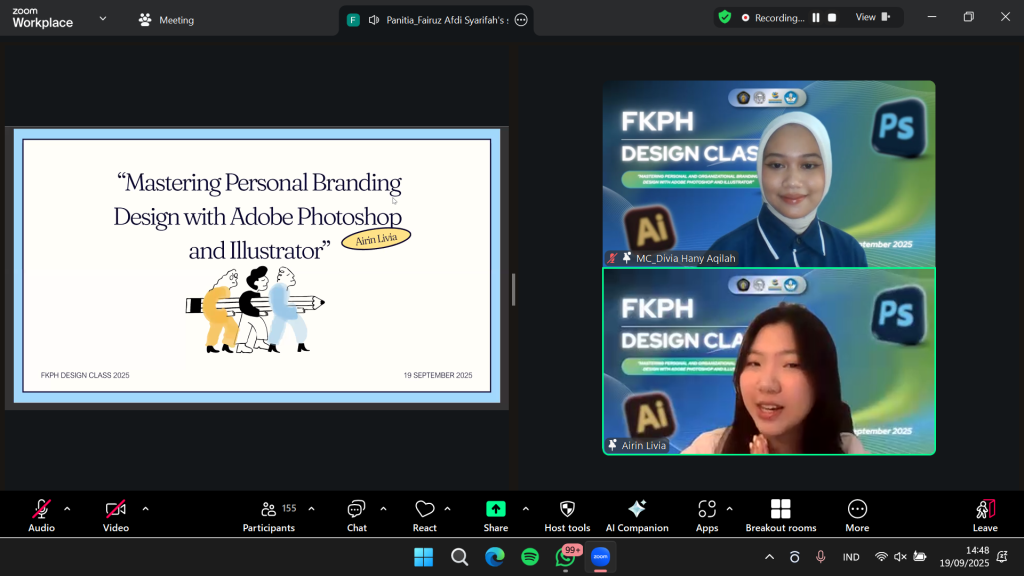 Kegiatan ini dibuka secara resmi oleh Master of Ceremony (Divia Hany Aqilah) dan dilanjutkan dengan sambutan dari Ketua Pelaksana FKPH Design Class 2025 (Muhammad Abyasa Hasan) serta Direktur Utama FKPH (Nurhasim). Setelah pembukaan, kegiatan dilanjutkan dengan sesi pemaparan materi dan praktik desain yang dipandu oleh narasumber berkompeten, yaitu M. Syahdanial Haq, selaku Kepala Biro Pusat Komunikasi dan Informasi EM UB 2025. Selain itu, turut hadir narasumber lainnya yang tidak kalah berpengalaman, yaitu Airin Livia Tjendratama, seorang Certified Graphic Designer & Illustrator, yang telah banyak memberikan kontribusi dalam dunia desain grafis. Kedua narasumber menyampaikan materi secara interaktif melalui platform Zoom, dan peserta turut terlibat langsung dalam praktik desain yang bertujuan untuk memperdalam pemahaman mereka terkait desain personal dan branding organisasi.